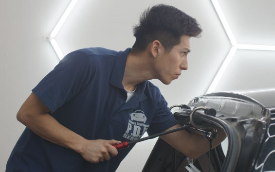 凹みを裏側から専用特殊工具で丁寧に押し戻すことにより、歪みまでコンロトールしとても早く綺麗に直せるのが特徴です。塗装しないで修復することにより、とても早く綺麗に、そしてお安くご提供することが出来ます。